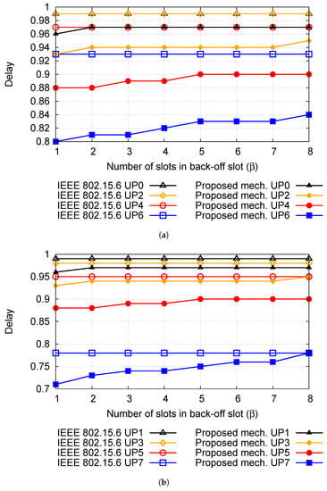 Delay comparison of IEEE 802.15.6 and proposed mechanism for different UP (Scenario 3). (a) Delay comparison for UP 0, 2, 4, and 6; (b) delay comparison for UP 1, 3, 5, and 7.