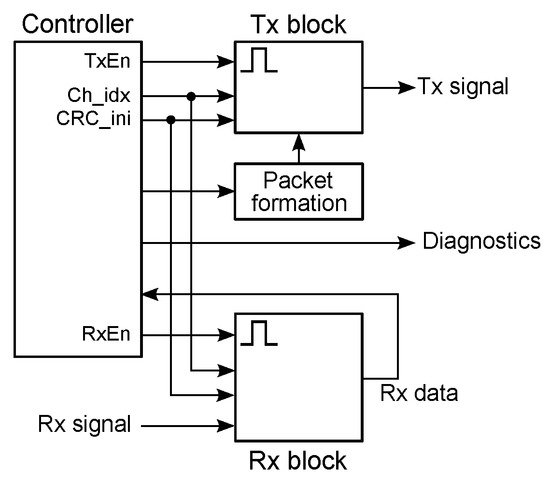 The key elements of the library are the BLE master and slave devices, the common internal block diagram of which is shown in Figure 2. The operation of the devices is controlled by a Stateflow chart (controller), which enables or disables the transmitter (Tx) and receiver (Rx) blocks (only one block can be active at a time), sets the channel index in the range from 0 to 39 (indices 37, 38 and 39 are used for 3 primary advertising channels with center frequencies 2402, 2426 and 2480 MHz, respectively, while the indices from 0 to 10 and from 11 to 36 are used for 37 data channels with center frequencies , and , , respectively [24] p. 2864), initializes a linear feedback shift register for CRC (cyclic redundancy check) generation, controls the formation of the packets, etc. The Tx block is responsible for bit stream processing (CRC generation, whitening [24] p. 2923) and formation of the radio frequency (RF) signal—the BLE system operates in the 2.4 GHz ISM band and uses 40 RF channels with center frequencies MHz, where ; the modulation is Gaussian Frequency Shift Keying (GFSK) with a bandwidth-bit period product BT and a modulation index 0.5 ([24] p. 2833); a binary one and zero are represented by +250 kHz and −250 kHz frequency deviations, respectively, while a symbol rate is 1 Msym/s. The Rx block demodulates the received signal and performs dewhitening and CRC checking operations. At packet reception, the Access Address is checked first. If the Access Address is correct, the packet is considered received, otherwise the packet is rejected. If the CRC is correct, the packet is considered valid, otherwise the packet is rejected ([24] p. 2923).