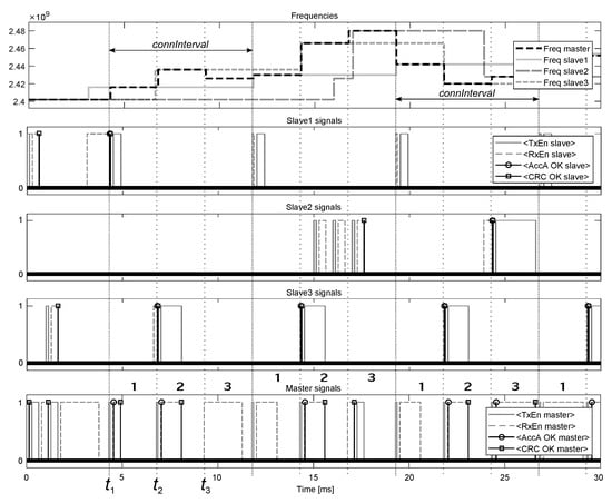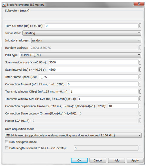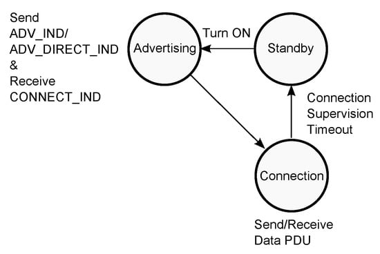 At the start of simulation, the master resides in the Standby State (Figure 8). At Turn ON time, the master enters the Initiating State and starts to listen on the 3 primary advertising channels for the advertising packets (Figure 4). If the packet is received, the master sends the initiating packet CONNECT_IND to the slave and transitions to the Connection State. The CONNECT_IND packet contains all the parameters (Access Address, initialization value for the CRC calculation, transmit window size, transmit window offset, connection interval, etc.) that are necessary for establishing the connection between the master and the slave ([24] p. 2881). In the Connection State, the master sends and receives the data packets to and from the slave. If the connection is lost and the master’s connection supervision timer reaches the Connection Supervision Timeout, the master returns to the Standby State.