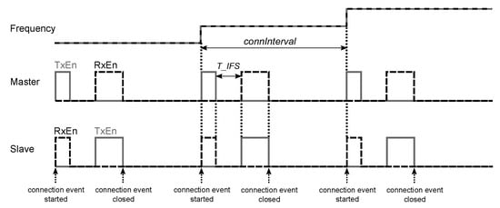 Connection interval—the time interval between the start of consecutive connection events, which are regularly spaced in time (Figure 5); must be a multiple of 1.25 ms in the range from 7.5 ms to 4.0 s ([24] p. 2980); therefore, ms, where is the integer;