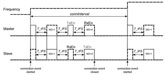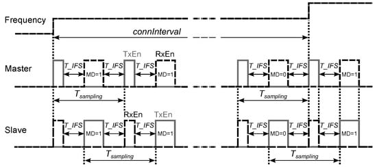 - MD bit is used—slave sets the MD bit in its data packets to 1 to indicate that it intends to continue the connection event; this mode enables the continuous and equally spaced in time data transmission from the slave to the master with the period less than 7.5 ms, which is the minimum connection interval (Figure 12); to achieve this, the must be an integer l multiple of us, where 80 us is the length of the empty data packet from the master, 150 us is the inter frame space succeeding the master’s and the slave’s data packets, is the length of the data packet from the slave and ;