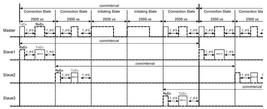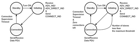 The state diagrams of the master device in one slave and multiple slaves modes are similar (Figure 8). The difference is that in the latter case the master can return from the Connection State to the Initiating State to listen for new advertisements, while in the former case it is not possible. In the multiple slaves mode, after creating the connection with the first slave, the master subdivides the specified connection interval into 2500 us subintervals, the length of which is determined by the maximum value of the sum us, where 80 us is the length of the empty data packet sent from the master to the slave, 150 us is the inter frame space succeeding the master’s and the slave’s data packets, and is the length of the data packet sent from the slave to the master, where octets is the length of the Paylaod in the slave’s data packet. If ms is not the multiple of 2.5 ms, then the last subinterval is ms long, while the rest subintervals are 2.5 ms long.