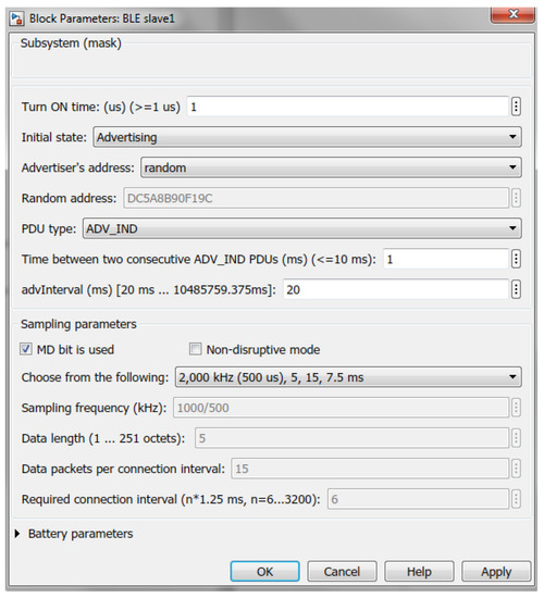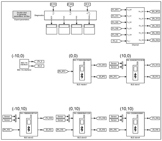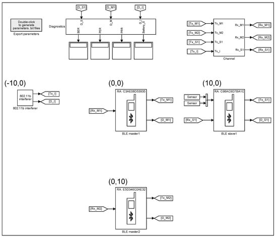 The BLE wireless sensor network library (Figure 1) allows to build the models for simulating the communication between multiple BLE devices. The library includes configurable blocks of BLE master and slave devices, a sensor, an 802.11b interferer, a transmission channel and a diagnostics block. For creating the initial BLE models, a special MATLAB function (explained in Section 2.8) can be used, which allows specifying the locations of the devices to determine the distances between them and the corresponding path attenuations of the transmitted signals.