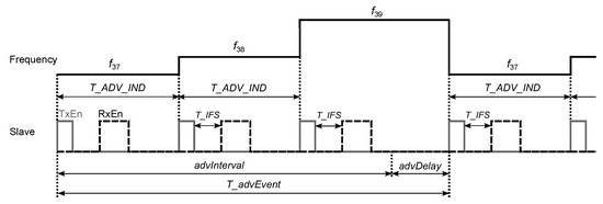 Time between two consecutive ADV_IND PDUs—the time interval ms between the start of two consecutive advertising packets within an advertising event ([24] p. 2938); the advertising event is composed of three advertising packets sent on 3 primary advertising channels starting from the channel index 37 and ending with the last channel index 39 (Figure 11); after each advertising packet, the slave listens on the same channel for the initiating packet from the master—if the CONNECT_IND packet is received, the advertising event can be closed early;
