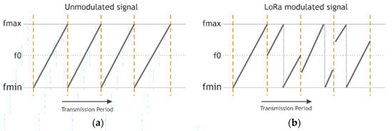 The external environment information after being collected is transformed into an electromagnetic signal for later transmission. Nevertheless, this signal first needs to be modulated in order to be able to propagate to the receiver, considering the distance and the data amount to be transmitted. LoRa modulation uses a spectral spreading technique based on the Chirp Spreading Spectrum technique, which translates into a sinusoidal signal of variable and random frequency called Chirp that uses the entire bandwidth of the channel to carry out its propagation [22,25,26]. As the name suggests, Chirps are used as signal carriers that must be transmitted at different and randomly selected frequencies for each transmission to enable more viable communications. Each one of these Chirps encodes x bits and will be rearranged in x Chips (several pieces of the same Chirp arranged along with the bandwidth at different frequencies in order to make up their value) [22]. An example of an unmodulated signal and a LoRa modulated signal can be seen in Figure 1.