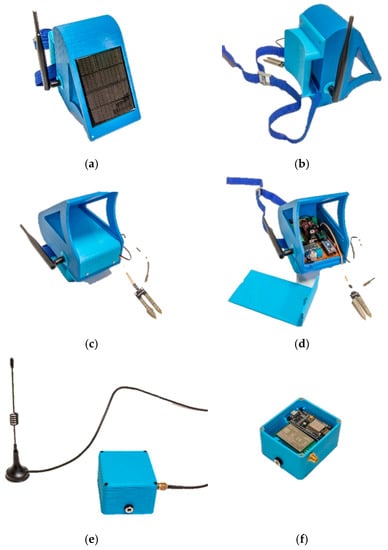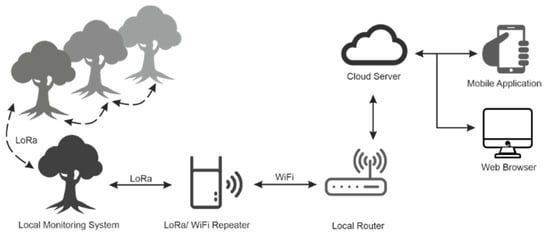 Once the device is built with the chosen constituents for optimal monitoring, it is possible to observe in Figure 3 the representation of the proposed operating structure. This communication structure was designed in such a way as to require a minimum of evasive changes both in the olive tree itself as in the existing infrastructure, and simultaneously to maximize the user’s access to monitored data. Thus, a device was developed that is attached to the olive tree trunk to be monitored and that reads all the required parameters. In order to receive data from all the olive trees monitored in an olive orchard, a central repeater station was also developed, as shown in Figure 2e,f.