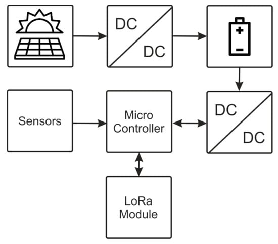 The block diagram topology of the device’s charging system is shown in Figure 4. The device is powered by photovoltaic energy. For an efficient photovoltaic energy extraction, i.e., for the maximum power to be extracted at all times and for the Li-ion battery charging to follow the appropriate profile, an isolated DC/DC converter with Buck topology was used, which has an integrated Constant Voltage MPPT algorithm. A second non-isolated DC/DC converter with Buck/Boost topology is used to correctly power the microcontroller, the communication module, and the various sensors. Hence, it will be possible for the system to remain operational even in cases where the battery voltage levels are low. A 2600 mAh Li-ion 18,650 battery was used and charged by the CC-CV method.