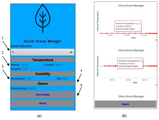 A mobile application for the Android platform was specially developed to allow the user to access the monitored data anywhere. Real-time data of each olive orchard sector can be analyzed in the application, as shown in Figure 5a, as well as a history of all monitored data with information concerning the day, month, year, day of the week, and the hours of each acquisition as showed in Figure 5b.