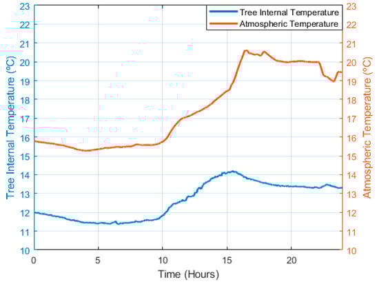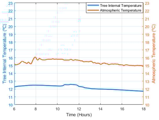Experimental test 1 was conducted for 12 h (h), starting at 6 a.m. and ending at 18 p.m. Figure 7 shows the internal and external (air) tree temperature variation over time. The ambient temperature initiated with a temperature value of 15 °C at 6 a.m. and continued to rise until 8 a.m. due to the sun rising in that period. At 12 a.m., approximately, a gradual decrease in temperature was perceived until the end of measurements as a result of clouds. Despite all these environmental changes during the day, the temperature variation, when comparing the initial and final measurements, was practically null and the largest temperature amplitude was only 1 °C.