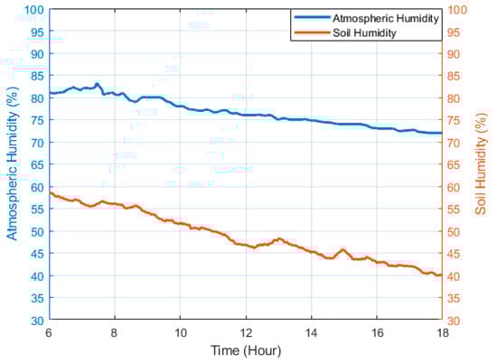 The variation between the lowest and highest peak for atmospheric humidity was 11%, and for soil humidity was 19%. The soil humidity values were always lower than the atmospheric humidity values. Additionally, the variation of the soil humidity was high. These conditions arose from the location of the sensor under the tree canopy during the acquisition period, as well as the fact that the soil sensor was placed in the root area where the water, essential for the sensor measurement process, was absorbed.