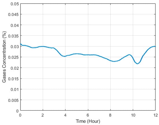 Figure 9 shows the gas concentration measured with the MQ-135 sensor. It can be concluded that the gas concentration in the tree’s surrounding atmosphere is relatively low, since it does not even reach 1% on a scale of 0–100% of harmful gases detected by the sensor. Although measurements suffered from some variation over the measurement period, it was only 0.01%, which is not a significant variation concerning the measured values.
