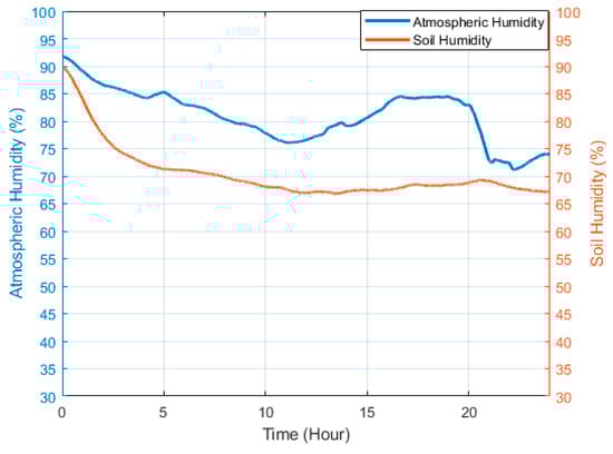 Atmospheric and soil humidity (%) evolution over time—Experimental test 1.