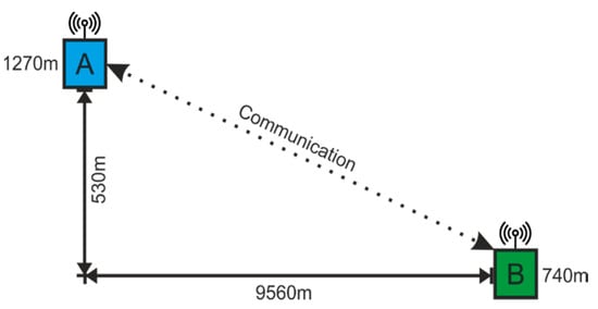 Figure 12 shows the orographic conditions of the carried-out test between the communication points, gateway (B) and the end device (A). In the tested conditions, it was possible to guarantee stable communication for a communication range of approximately 10 km.