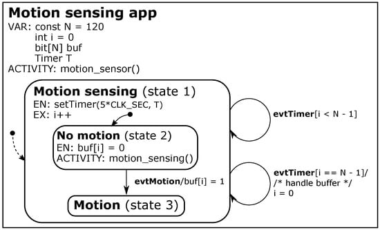 Designing statecharts begins with identifying states of the system. In the given case, shown in Figure 1, the system is in a Motion sensing (state 1) state of sampling motion data after the initialization state (not shown). This state repeats periodically, driven by a timer-expired event evtTimer. On event occurrences, the event guard validates the transition. Therefore, evtTimer triggered transition on the right is taken when the buffer is not full, judging by condition ; otherwise, the bottom transition is taken. Hosting by Motion-sensing state, a sub-state machine reflects motion detection results and acts accordingly. In each sampling cycle, it is evident that no motion is detected as at the beginning, as in No motion (state 2) state. Detecting a motion event moves a sub-state machine to Motion (state 3) state and records a 1 in the buffer.