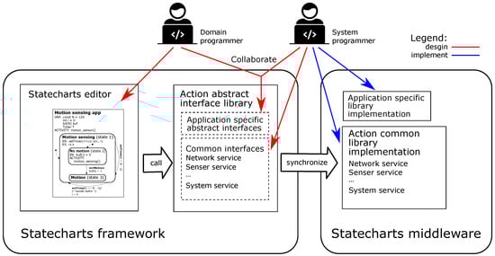 The statecharts approach aims to improve the WSN application development experience by distinguishing domain-specific programmers and system-specific programmers. Figure 2 demonstrates collaboration between a domain-specific programmer and a system-specific programmer. A domain programmer designs a statecharts application using the statecharts editor. The application uses abstract actions from the action abstract interface library to actuate WSN sensor nodes. Meanwhile, a system programmer implements action library collections in the statecharts middleware. The implemented actions will be automatically synchronized to the statecharts framework database. However, there are always application-specific actions unaccounted for by common library collections. The domain programmer and the system programmer would collaborate to design the application-specific abstract interfaces. Thus, the system programmer would implement these functions in the middleware, while the domain programmer would be back to the statecharts design.