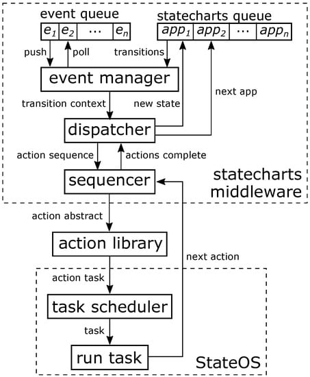 Statecharts are often used as a tool to guide the coding progress. Alternatively, an advanced usage is to input statecharts to compatible code generators, such as implemented in [14]. However, the code produced using the code generator is highly platform-dependent, difficult to maintain, and potentially deviates from the original intentions. Inspired by SenOS [11,15], we propose using statecharts as a context that describes the scenarios of invoking actions over associated event occurrences. Therefore, a statecharts application effectively serves as a manual that guides an operating system’s response to events. To support this mechanism, we implemented a statecharts middleware that includes a statecharts interpreter and an action library implementation. As a result, the raw statecharts context running on board, is reflected by the scenario of invoking specific actions over event occurrence schema.