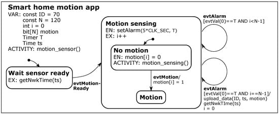 The SmartHome application is an example of how the statecharts approach can be used in a daily life application. This application aims to provide in-house information regarding senior people’s well-being to home-care nurses [45]. The application’s design adopts an IoT architecture, including a wireless sensor network, a gateway, and cloud services. The application was developed step by step over three years. The statecharts approach was introduced to our development process for group communication purposes. By using statecharts, our domain experts understand the WSN application easily. Furthermore, they can make suggestions and validate whether the application meets the domain-specific requirements.