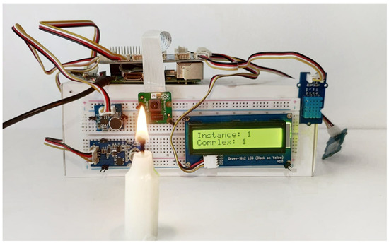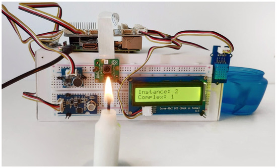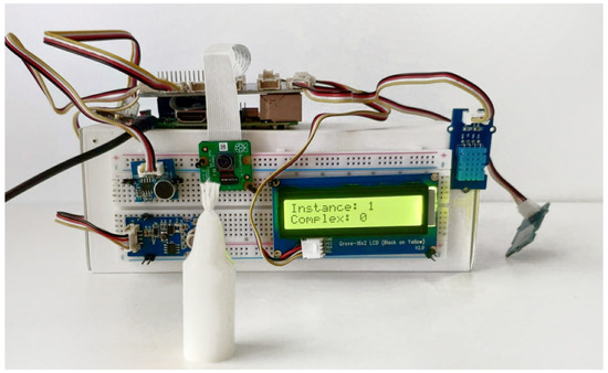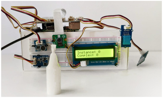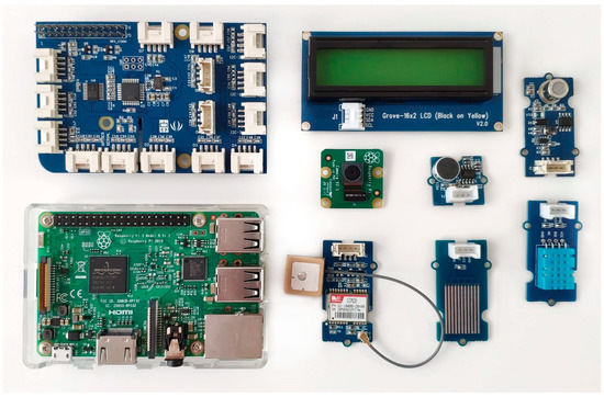 Figure 3 presents the electronic components that were used to create the proof-of-concept EDU (wires are also required). In the figure, we can see a Raspberry Pi 3B+ board, a GrovePi+ HAT (Hardware Attached on Top), a Raspberry Camera v2, a GrovePi+ GPS module and four different GrovePi+ scalar sensors (audio, water, air pollution and humidity). Finally, we used a 16 × 2 LCD display to easily present the number of currently detected events.