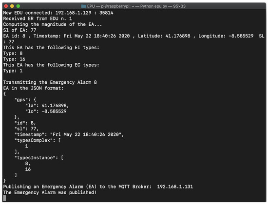 For the experimental EDU, we created a continuous loud noise, raising the detection of 1 instance event every 5 s (). The detection of that event is shown on the LCD display and an Events Report (ER) is transmitted to the EPU—the EPU was executing on an Intel i5 8 GB RAM server. That scenario is demonstrated in Figure 5.