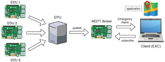Since the proposed system is composed of different elements that communicate through some networking infrastructure, the existence of permanent and transient communication failures should be also accounted for. In fact, the use of reliable protocols is an important element in this sense, but other aspects are also relevant when concerning emergencies detection. For example, since an EDU will “cover” a particular area, its disconnection may result in emergencies that are not being properly detected: in fact, it may be detected, but the EPU is not being informed. Some previous works have addressed this issue, employing different formalisms for that [44,45], but with some limitations. However, some strategies can be used to enhance reliability even in the presence of emergencies, usually employing wireless communication technologies since they are more resistant to critical situations [46]. Additionally, the proposed system could be extended to provide an active synchronous probe service to transmit a “ping” message from the EPU to all EDUs, checking if they are active. Such a service will be addressed in future works.