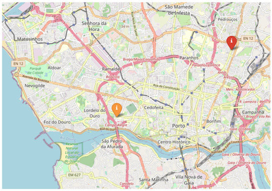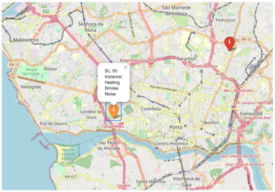In order to assure robustness to the overall system, the Events Reports are constantly refreshed by the EDUs, resulting in a refreshing frequency for the alarms. This operation was proposed by us in ref. [7] and it consists in “positive feedback”, informing only about detected events. Doing so, any event is indirectly assumed as undetected when it is not being reported, and the same is true for the alarms. For the developed application, which is also available in the open repository at https://github.com/lablara/cityalarmcamera.git, the pins are only presented when alarms are received, being removed if they are not being received after 60 s (it is a configuration parameter).