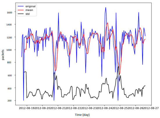Most time series forecasting techniques require the time series to be stationary. Stationarity indicates that the statistical properties of the time series remain constant over time. For a time series to be stationary, it needs both the standard deviation and the mean to not change over time. The rolling mean and the rolling standard deviation of the load of each base station over the seven days were calculated to test the stationarity of the load of the base stations. It was observed that the mean and standard deviation of the time series in the dataset were not constant over time, demonstrating that the load of the base stations was not stationary. Figure 2 illustrates the load of a sample base station and displays the rolling standard deviation and rolling mean through the week. Hence, the dataset required additional transformation to convert it to a stationary time series.
