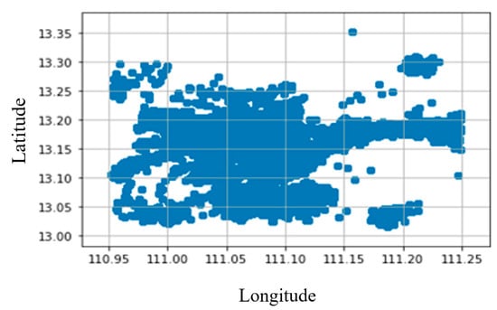 The dataset used in this research is the City Cellular Traffic Map (C2TM) [14], collected in China for a cellular area of 50 km × 60 km during the period from 19 August 2012 to 26 August 2012. The dataset covers the hourly traffic load on 13,296 base stations for seven days or 168 h. The Georgian calendar is used for the representation of time. For the location, the longitude and latitude of the connected base stations are reported in the dataset. Due to privacy reasons, the locations used in this dataset are not the real locations of the base stations but rather meshed locations [14].