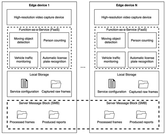 The reference architecture diagram for service provisioning on VD is shown in Figure 1. A general purpose Edge device can be equipped with several sensors or peripheral hardware to provide differentiated services, such as a high-resolution camera, audio capture systems and temperature, humidity or air quality sensors. Several configurable functionalities (implemented according to the FaaS paradigm) can vary from moving object detection to person counting, from vehicle traffic monitoring to license plate recognition, and can be activated on-demand. In particular, services are deployed using containers to take advantage of virtualization technology allowing service portability, resiliency and automatic updates. The FaaS approach is adopted for an easy configuration on-the-fly of the device, especially if switching among different services is required during the time. A configuration file for each service is kept in a local storage area on the device, as well as the raw frames captured from the camera without any elaboration applied. Processed frames and reports are accessible remotely using a Server Message Block (SMB) protocol. This configuration can be replicated for any number of Edge devices available, for example, to cover the city center area. To secure the communication between the Edge device and the endpoint, a Virtual Private Network (VPN) is configured.