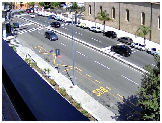 With reference to the video processing at the Edge scenario, we aimed at controlling vehicles crossing a specific area in the city. To this purpose, a webcam is placed to monitor a specific road junction of the city. An example of a frame captured with a 640 × 480 resolution is shown in Figure 2. A dedicated Web Server Gateway Interface (WSGI) has been developed with the Python web application framework Flask and can be accessed to look at the captured live stream of the camera device. All the service functionalities have been configured as FaaS to leverage the flexibility of on-demand capabilities based on municipality needs and can be easily switched. All the captured raw frames are saved in a local storage folder and kept for one week (the storage persistence is configurable according to the memory capacity of the Edge device). The processed frames and reports are accessible remotely through the File Transfer Protocol (FTP) or accessing the directory with a network protocol like Samba. The number and effectiveness of the applied manipulation filters can be configured on-the-fly to improve the captured image based on the changing environmental conditions, such as day-night shift or sunny-rainy day. It is important to note that processing time and resource usage at the Edge is not affected by the changing of such filters.