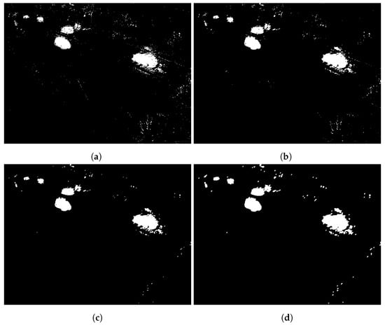 (a) Background layer with no filter applied; (b) opening filter applied to remove background noise; (c) closing filter applied to fill object gaps; (d) dilate filter applied to join adjacent objects.