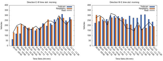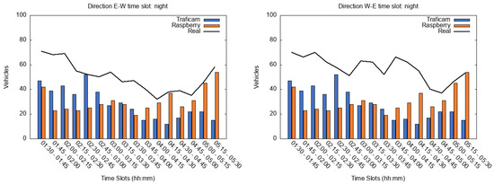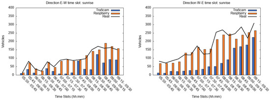 In Figure 6, the behavior during the time slot “night” is shown. As the reader can observe, the performance of both devices is comparable. However, observing the video, we noticed that the accuracy of both devices is quite low. This is because the resolution of the Traficam is quite low and, therefore, some vehicles, especially the dark ones, are not recognized. With reference to the Raspberry Pi device, our algorithm is not able to distinguish vehicles from their own headlights and, thus, it does not increment the vehicle counter. With the increasing of illumination, the behavior is different. Starting from 04:30 a.m., the number of vehicles detected from the raspberry, especially in the direction W-E, increases.