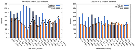 In the time slot “morning”, as the reader can observe in Figure 8, we can distinguish different behaviors. In particular, chart “E-W” shows two different behaviors depending on the position of the sun. From 9:30 to 10:15 the Raspberry-based system is able to detect more vehicles with respect to the Traficam. In contrast, since 10:15 the light conditions are good for both devices. There are only a few discrepancies in the number of vehicles detected by Traficam and Raspberry respectively. This is due to the presence of big vehicles such as trucks or buses and cars crossing two lanes. Considering the direction “W-E” is it possible to observe three different behaviors: (i) from 9:30 to 10:00 the Raspberry-based system is able to detect more vehicles with respect to the Traficam; (ii) considering the time period 10:00–11:30 the light conditions are good for both devices and we can note only a few discrepancies; (iii) instead, starting from 11:30, the light conditions are not ideal for the Traficam, in fact, as we can observe in the figure, there are considerable differences between the results of both devices. As we will discuss for the “afternoon” time slot, these discrepancies depend on the light conditions.