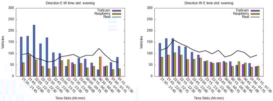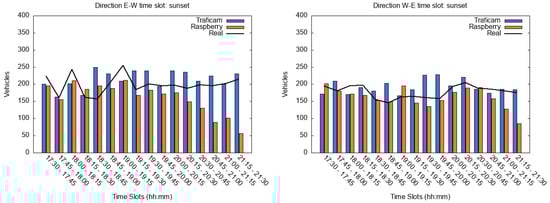 In Figure 10 the behavior of both devices during the time slot “sunset” is shown. The accuracy of both devices is quite good for a great part of the time slot. The only big difference is in the direction E-W after 8:00 p.m. As the reader can observe in the figure, due to the absence of environmental light, the vehicle headlights become more prominent and the Raspberry is not able to distinguish the vehicles.
