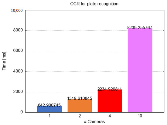 In addition to the vehicle counting task, we stressed the Raspberry performing the OCR on frames for the number plate recognition considering 1, 2, 4 and 10 cameras simultaneously connected to the same devices. As the reader can observe in Figure 13, the execution time increases almost linearly within the number of cameras. Considering our urban scenario, we can consider accepting the time required for processing up to four cameras on the same device.