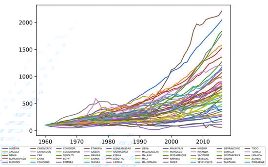 Levels of real GDP in 50 countries in Africa 1960–2016 (where Equatorial Guinea and Botswana are excluded due to very high growth rates), indexed at 1960 = 100. The data are obtained from (). These authors used imputation techniques to create a complete data set.