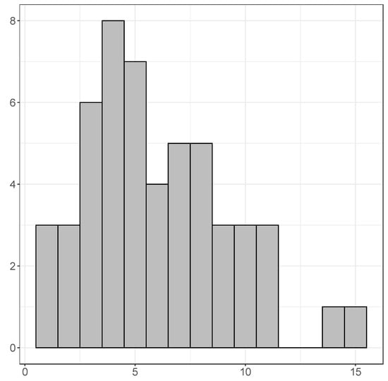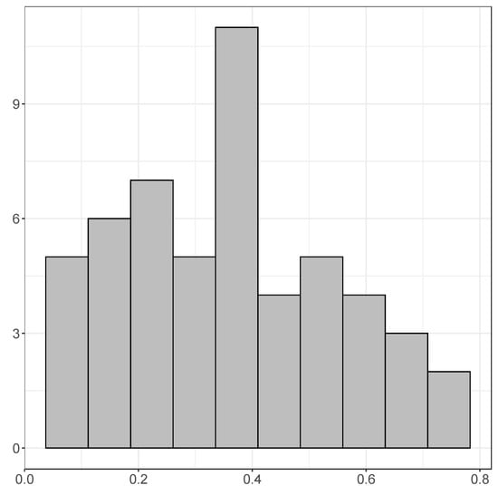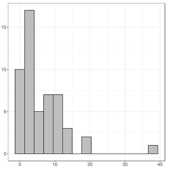 Figure 3 presents a histogram of the adjusted values of the models with estimation sample 1960 to 2015, and we find that the mean is 0.353, that the maximum is 0.710 (Rwanda), and the minimum is 0.039 (Somalia). Figure 4 presents a histogram of the mean errors (each time, the mean of the six one-year-ahead forecast errors), and there we find that the average mean error is , where for some countries the mean error is very large (−8.39 for Equatorial Guinea, and 7.36 for Ivory Coast). Figure 5 illustrates a histogram of the mean absolute errors. Note that this histogram was created without Libya, as for this country the one-step-ahead forecasts are very poor (MAE of 43.63). The average of the mean absolute errors (excluding Libya) amounts to 3.62, which is relatively larger than what is typically found for OECD countries (usually within the range of 1 to 2). For the RMSE the results are qualitatively similar.