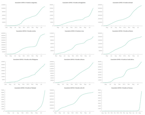 Cumulative deaths from COVID-19 for the 12 selected countries from 19 February 2020 to 20 August 2021. Source: Our World in Data (2021).