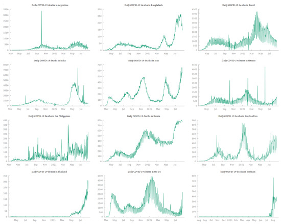 Daily deaths from COVID-19 for the 12 selected countries from 19 February 2020 to 20 August 2021. Source: Our World in Data (2021).