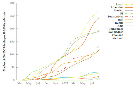The number of deaths from COVID-19 per 100,000 inhabitants in 12 hard-hit big countries from 19 February 2020 to 20 August 2021. Source: Author’s elaborations on Source: Our World in Data (2021) and World Bank (2021).