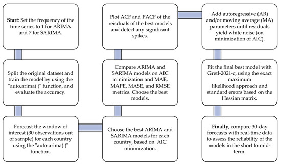 | 5 | For the ARIMA models, I used the following script: auto.arima(training_data,stationary=FALSE,seasonal=FALSE,ic=c(“aic”),stepwise=FALSE,nmodels=1000,approximation=FALSE,test=c(“kpss”)). While for the SARIMA models, I used the following script: auto.arima(train_argentina,stationary=FALSE,seasonal=TRUE,ic=c(“aic”),stepwise=FALSE,nmodels=1000,approximation=FALSE,test=c(“kpss”),seasonal.test=c(“seas”)). The same procedure was also applied to forecast the window of interest (from 21 August 2021 to 19 September 2021). |