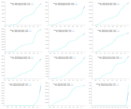 ARIMA forecasting models built on the training set over the period 1 August 2021–20 August 2021, in Argentina, Bangladesh, Brazil, India, Iran, Mexico, the Philippines, Russia, South Africa, Thailand, the US, and Vietnam.