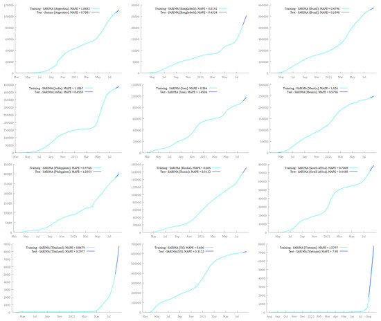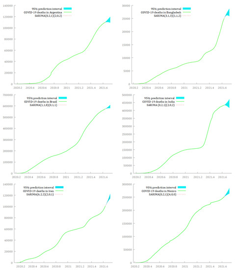 Therefore, the optimal number of parameters for predicting cumulative the deaths from COVID-19 for each country were the following (Table 5): Argentina (0,2,1)(2,0,2)7, Bangladesh (3,1,3)(1,1,2)7, Brazil (1,1,8)(0,1,1)7, India (0,2,1)(2,0,2)7, Iran (6,2,2)(2,0,1)7, Mexico (0,2,1)(4,0,0)7, the Philippines (6,2,4)(3,0,4)7, Russia (4,2,4)(4,0,3)7, South Africa (5,1,8)(4,1,4)7, Thailand (4,2,10)(4,0,2)7, the US (6,1,1)(0,1,1)7, and Vietnam (5,2,4)(0,0,1)7.
