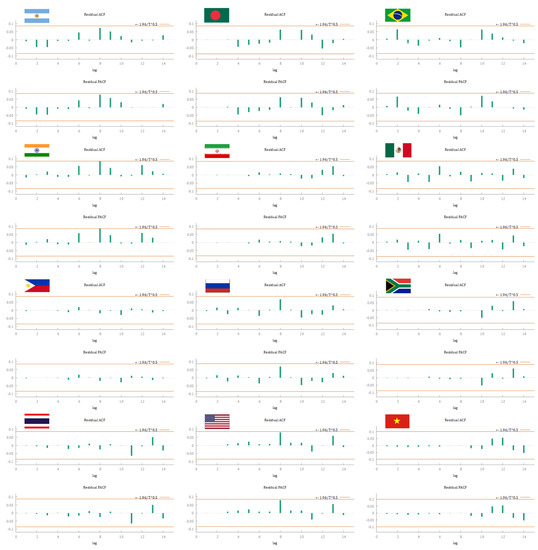 Since MASE was always much lower than 1, the actual forecast performance is much better than the naïve method (Table 5).14 In other words, the proposed method yields smaller errors than one-step errors from the average naïve method (Hyndman and Koehler 2006). According to Lewis (1982), the results of MAPE indicated that SARIMA models had very high accuracy. In fact, the MAPE difference between the observed and fitted data was much smaller than 10%, ranging from 0.34% for Iran to 1.92% for Vietnam. Notably, except for Argentina, India, and Vietnam, the remaining countries had a MAPE smaller than 1% (Table 5). The excellent goodness of fit is confirmed by the analysis of ACF and PACF of the models (Figure 7). In fact, both functions did not show any significant spike, suggesting that residuals were not correlated in all the countries analyzed. That is, the fitted data described a white noise process.