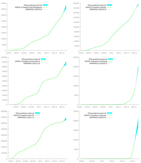 SARIMA models for forecasting the dynamics of cumulative deaths from COVID-19 over the period 21 August 2021–19 September 2021, in the Philippines, Russia, South Africa, Thailand, the US, and Vietnam.