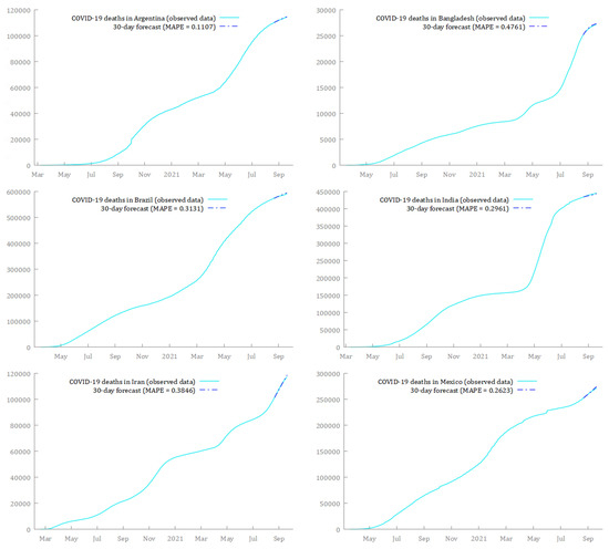 Comparison between forecasts and real data during the period 21 August 2021–19 September 2021, for cumulative deaths from COVID-19, in Argentina, Bangladesh, Brazil, India, Iran, and Mexico.