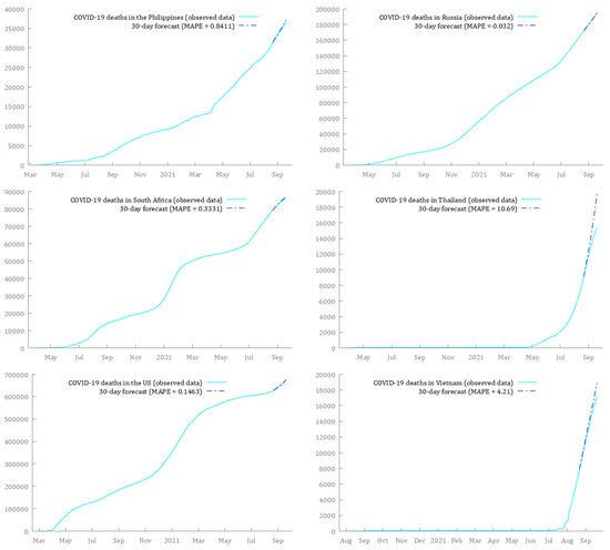 Comparison between forecasts and real data during the period 21 August 2021–19 September 2021, for cumulative deaths from COVID-19, in the Philippines, Russia, South Africa, Thailand, the US, and Vietnam.