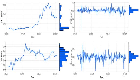 Figure 1 shows the daily Bitcoin and gold prices (left panels) and returns (right panels) throughout the sample period. The graphs show that the prices of Bitcoin are observed to slowly increase during the beginning of the pandemic and then peak remarkably until the mid of May 2021 before they steeply declined, when Tesla announced that it would suspend its vehicle purchases using Bitcoin (https://www.bbc.com/news/business-57096305 accessed on 5 May 2022).