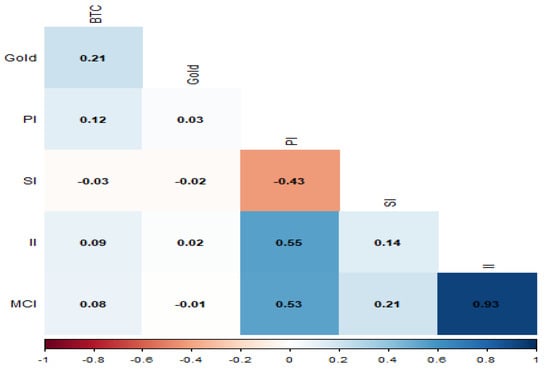 Table 2 provides descriptive statistics for all time series data. The daily mean and median of the Bitcoin return are about . This translates into a monthly return of about per month and into an annualized return of about per year. On the other hand, the daily mean and median of the gold return are about , which can be translated into a monthly return of about per month and into an annualized return of about per year. The very small positive values in Bitcoin and gold annualized returns indicate that both commodities could still act as safe havens during the ongoing pandemic.