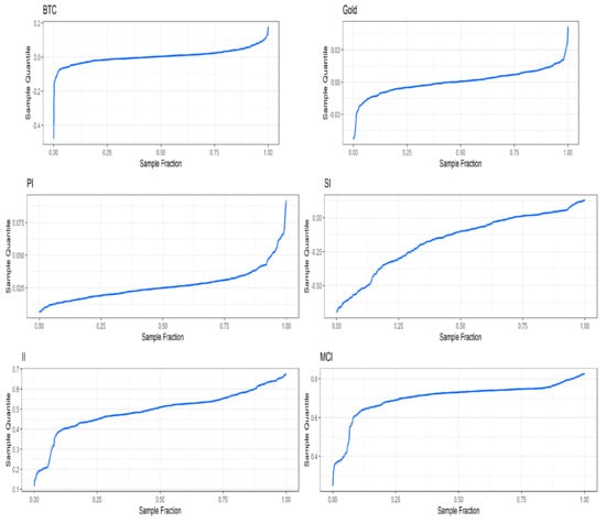 Figure 4 presents similar plots for all of the indices (except for the fear sentiment) generated by the COVID-19 pandemic news. Because of the nature of the sentiment index, its quantile plot can be seen in the same manner as other indices. For example, a large negative value of sentiment has a similar interpretation to a large positive panic value.
