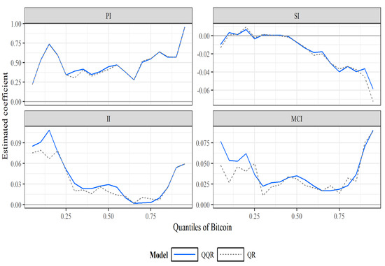 Figure 7 and Figure 8 compare the estimates of the slope coefficient based on the QR and QQR approaches at various quantiles of Bitcoin and gold returns, respectively. The graphs show that the QQR estimates are nearly identical with the QR estimates, which validate the results that the QR estimates can be recovered from the QQ estimates.